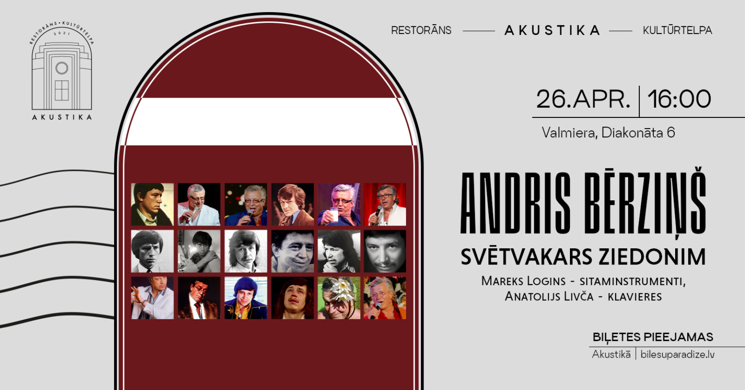 “It is created as a mirror of my work, in which the songs close to my soul are selected. This program does not require any comments, because it concentrates compositions that have proven themselves in time and space. The concert will feature my hits, including 11 pieces by Raimonds Pauls, which Maestro has presented to me – I am very happy about it. A sacred evening is a moment where you can meet people who respect you and love you” says Andris Bērziņš before the upcoming concerts. The artist will perform together with the accompanying musicians – pianist Anatolijs Livčs and the permitorists Mareks Logins “Svētvakars”, “Mēmā dziesma”, “Dzeguze balss”, “Spoka dziesma”, “Gampulks”, “Rudens ogle”, “I will sit on the roof tonight”, etc. The concert will be complemented by Imants Ziedonis’ epiphany and Jānis Peters’ poetry “I Love You”, which will be heard as a special tribute to all women of Latvia.